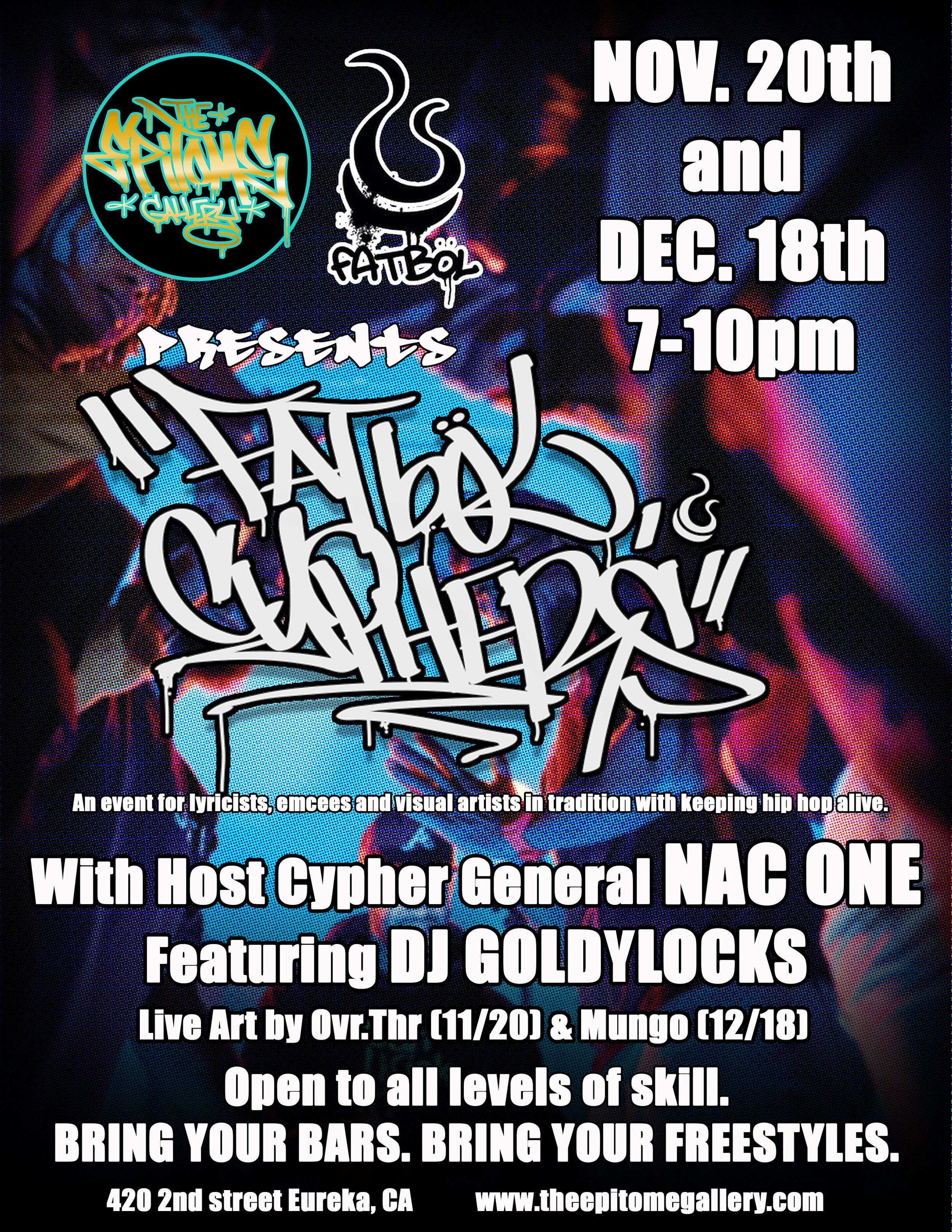 The Epitome Gallery and Fatbol presents… Fatbol Cyphers w/ Host Cypher General Nac One Featuring DJ Goldylocks “An event for lyricists, emcees and visual artists in tradition with keeping hip hop alive.” “Open to All levels of skill.” Bring your bars. Bring your freestyles