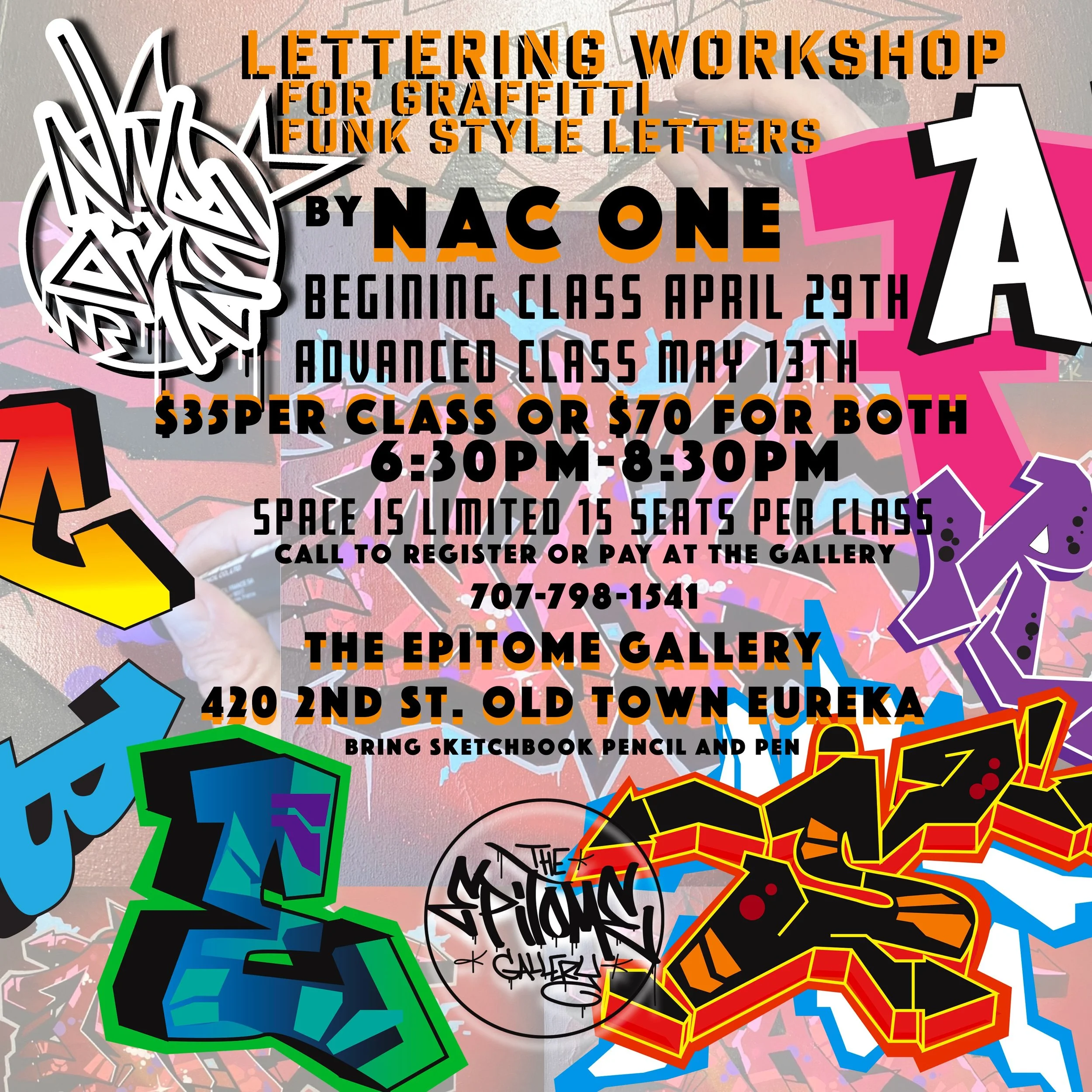Learn Graffiti Funk Style Letters from the legendary NAC ONE. $35 per class or $65 for both classes. Call (707)798-1541 or come into the gallery to sign up.